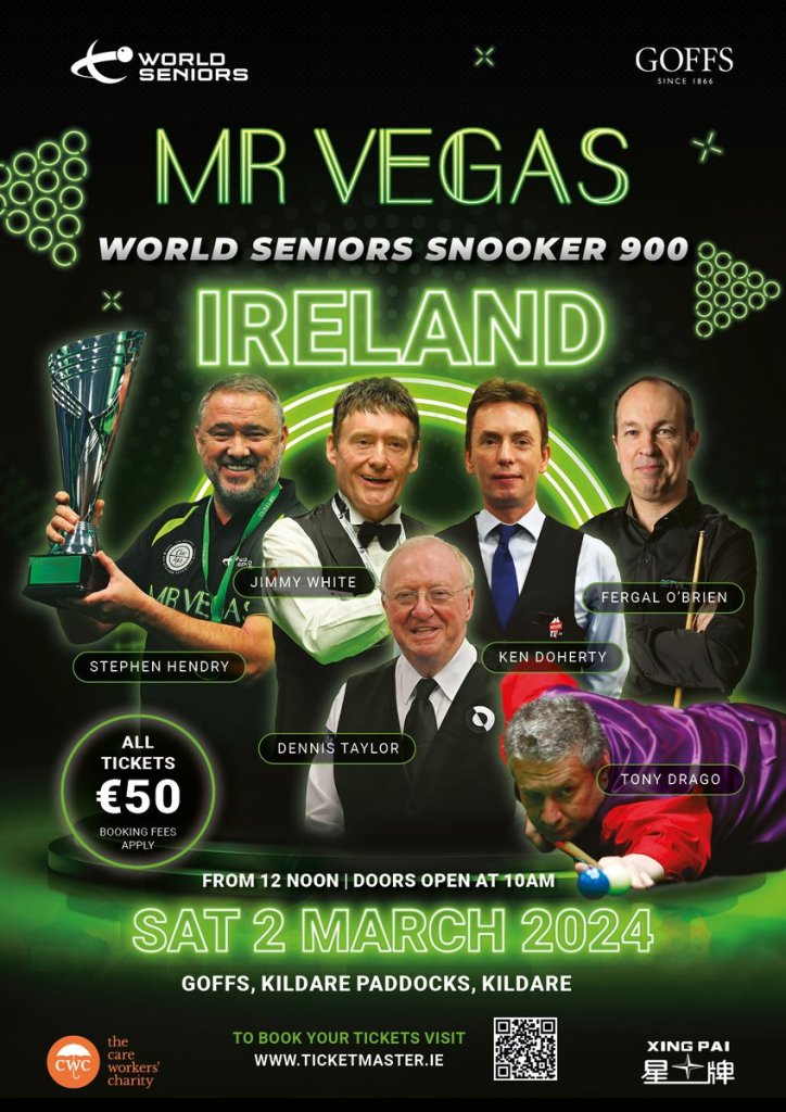 Following the success of the first Mr Vegas Seniors event, the “concept” moves to Ireland! Indeed the Irish fans will have the opportunity to attend the second Seniors Mr Vegas event “live” in no other than the the iconic Goffs arena … and support their very own Ken Doherty and Fergal O’Brien! I suppose that Denis Taylor will count as “Irish” under the circumstances as well.