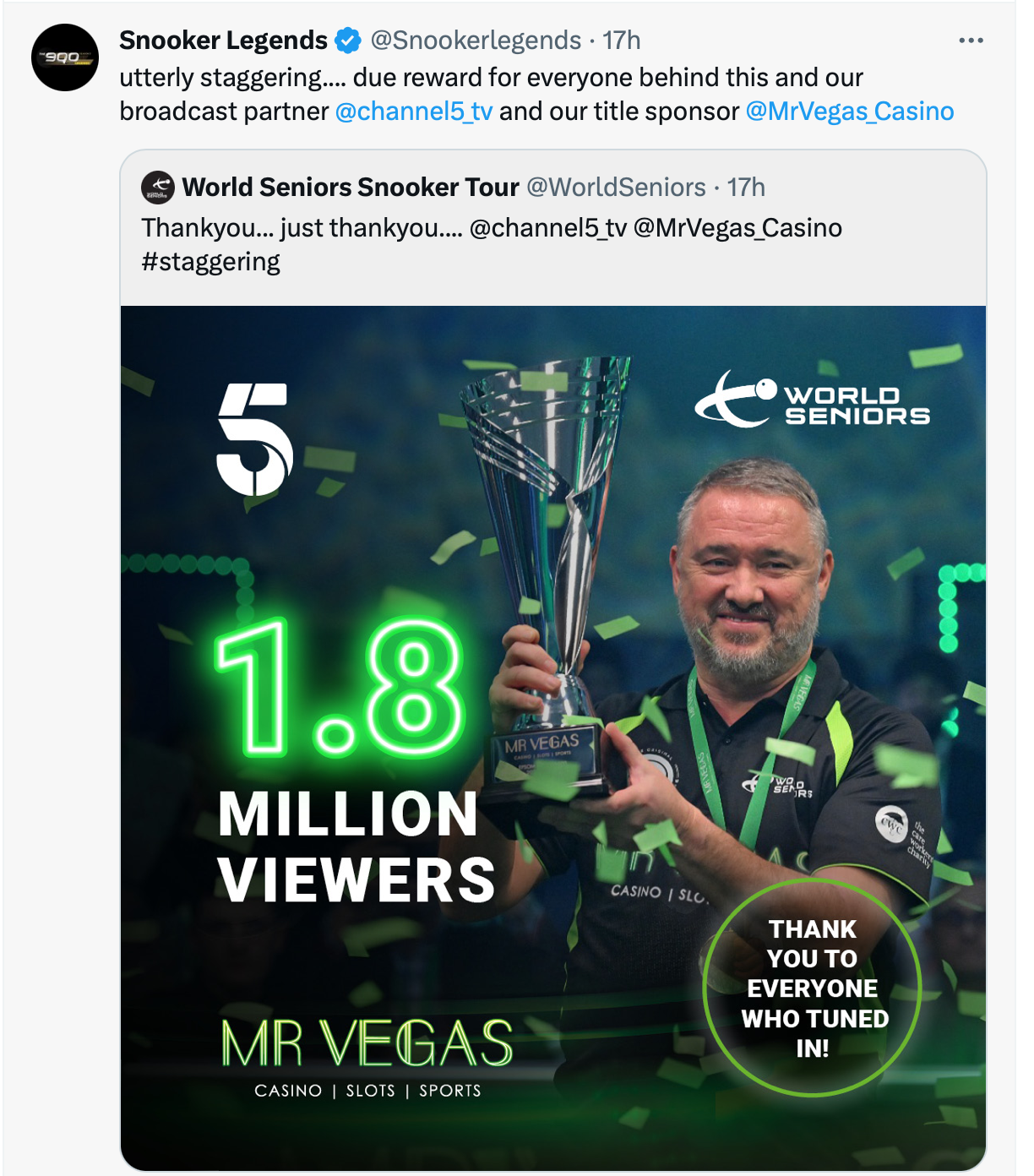Don’t forget that this was a first snooker event on Channel 5. That’s very, very encouraging.