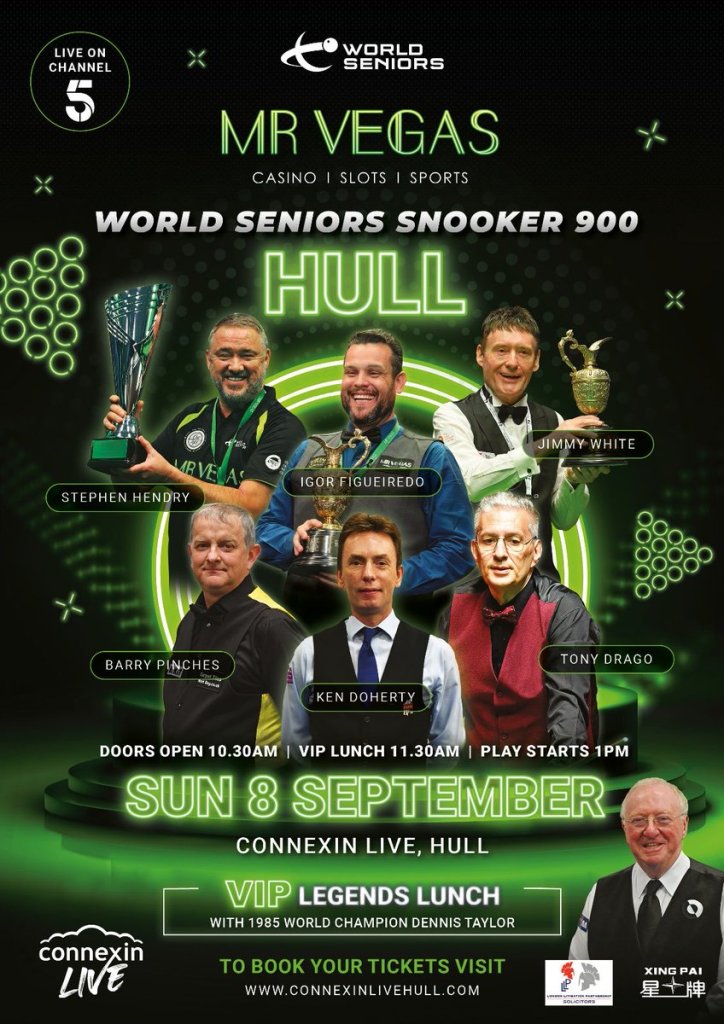 Jimmy White, Stephen Hendry and Ken Doherty will be among those in action when the Mr Vegas World Seniors Snooker 900 heads to the Connexin Live in Hull on Sunday 8 September.